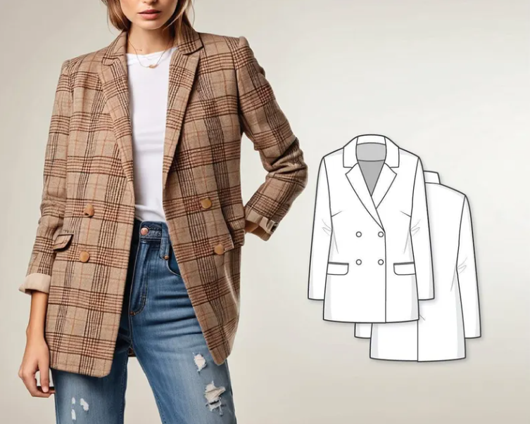 PDF sewing pattern of a classic women’s double breasted lined blazer. The sewing pattern in all sizes and heights will be instantly available for download after purchasing.