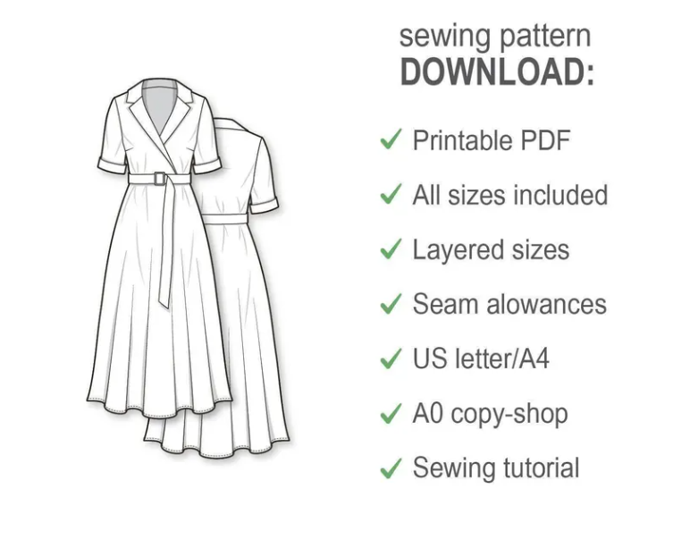 PDF sewing pattern of the women’s short cuffed sleeve lapel wrap shirt dress with a belt and A-line midi skirt. The sewing pattern in all sizes and heights will be instantly available for download after purchasing.